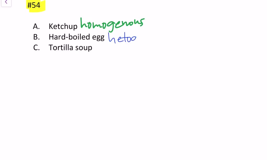 Solved Classify Each Of The Following As A Homogeneous Or Heterogeneous Mixture A Ketchup B Hard Boiled Egg C Tortilla Soup